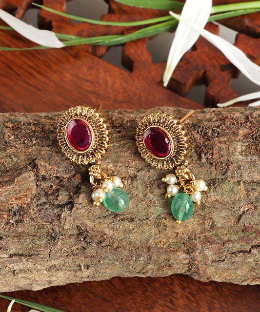 Antique Gold Stud Earrings with Ruby Stone & Emerald Drops