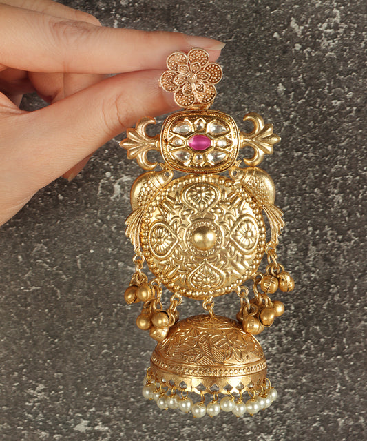 Floral Round Gold Jhumka Earrings with Ruby & Pearl Detailing