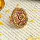 Handcrafted with intricate filigree work, this statement ring embodies the richness of temple jewellery. | The design features a bold floral motif with ruby-toned petals and an emerald-green centerpiece for contrast. | Finished in antique gold plating, it reflects traditional artistry blended with timeless elegance. | The large oval shape creates a regal statement while the adjustable band ensures a perfect fit. | Ideal for weddings, festive occasions, and cultural celebrations, pairing beautifully with ethnic and Indo-western outfits.