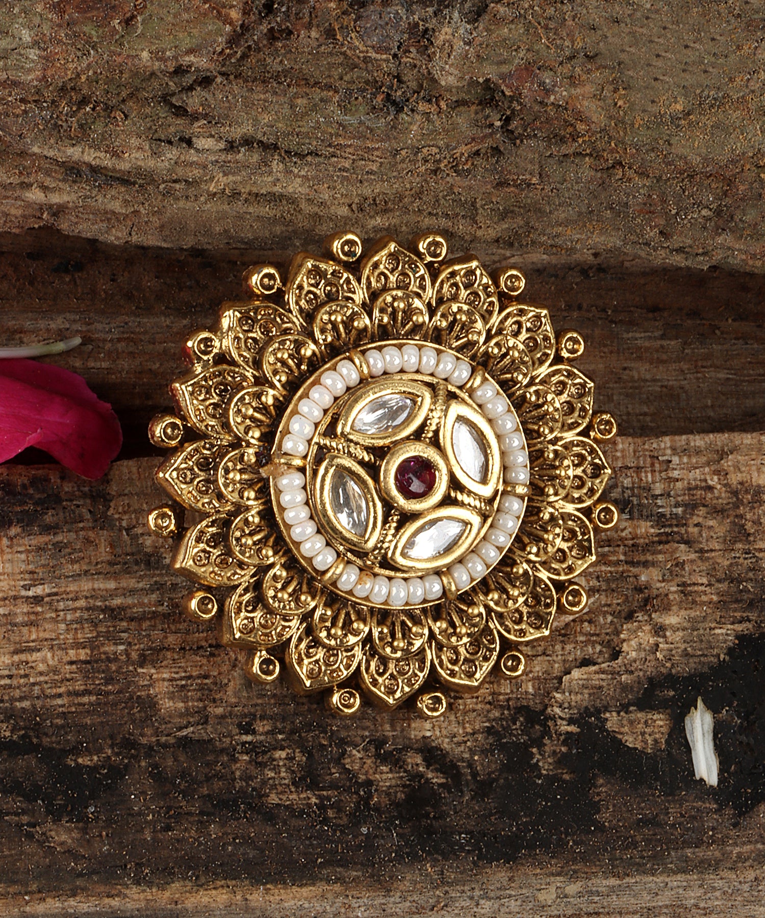 Handcrafted with precision, these temple-inspired stud earrings showcase a detailed floral design that reflects timeless Indian artistry. | The earrings feature polished kundan stones beautifully set around a central ruby-toned accent, adding a regal touch. | Finished in a rich antique gold plating, they bring heritage charm while staying versatile for modern styling. | Lightweight and comfortable, they are perfect for all-day wear without compromising elegance. | An ideal choice for festivals, weddings, and traditional celebrations, these earrings pair effortlessly with sarees, lehengas, and Indo-western outfits.