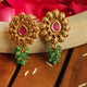 Handcrafted in temple jewellery style, these earrings feature a bold floral-inspired stud design. | The centerpiece highlights a pear-shaped ruby-toned stone set in antique gold detailing. | A cluster of emerald green beads dangles gracefully, adding vibrancy and festive charm. | Finished in antique gold plating, they blend heritage artistry with modern elegance. | Perfect for weddings, pujas, and special occasions, pairing beautifully with sarees, lehengas, and ethnic attire.