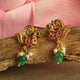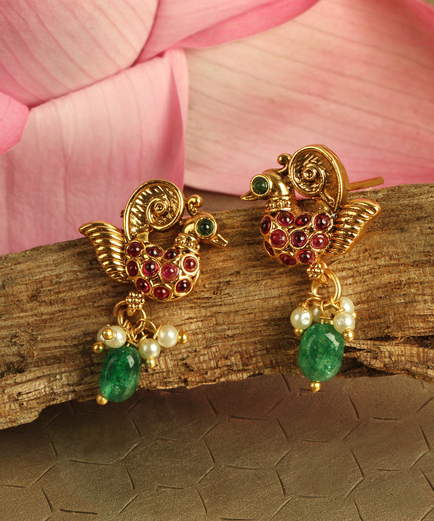 Crafted in a graceful peacock motif, these earrings reflects the beauty of traditional Indian jewellery. | Adorned with ruby-toned stones across the body and an emerald stone on the head, it carries regal charm. | A striking green bead drop with pearl accents adds movement and elegance to the design. | Finished in antique gold plating, the brooch is a versatile accessory for sarees, dupattas, and festive wear. | Perfect for weddings, special occasions, or as a collectible statement piece.