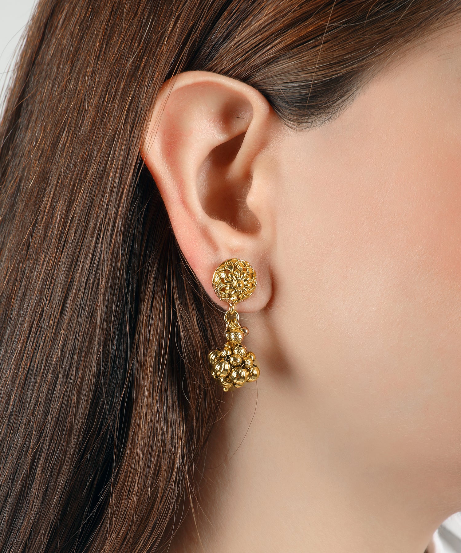Crafted with precision, these floral cluster gold-plated earrings showcase intricate detailing inspired by traditional Indian artistry. Designed in a rounded floral shape with dangling bead clusters, they highlight the timeless charm of handcrafted jewelry. Originating from skilled artisans of Rajasthan, the earrings are lightweight and comfortable, making them perfect for all-day wear. Pair them with ethnic sarees, lehengas, or even contemporary fusion wear for weddings, festive occasions, or celebrations. The rich gold plating ensures durability while enhancing their luxurious appeal.