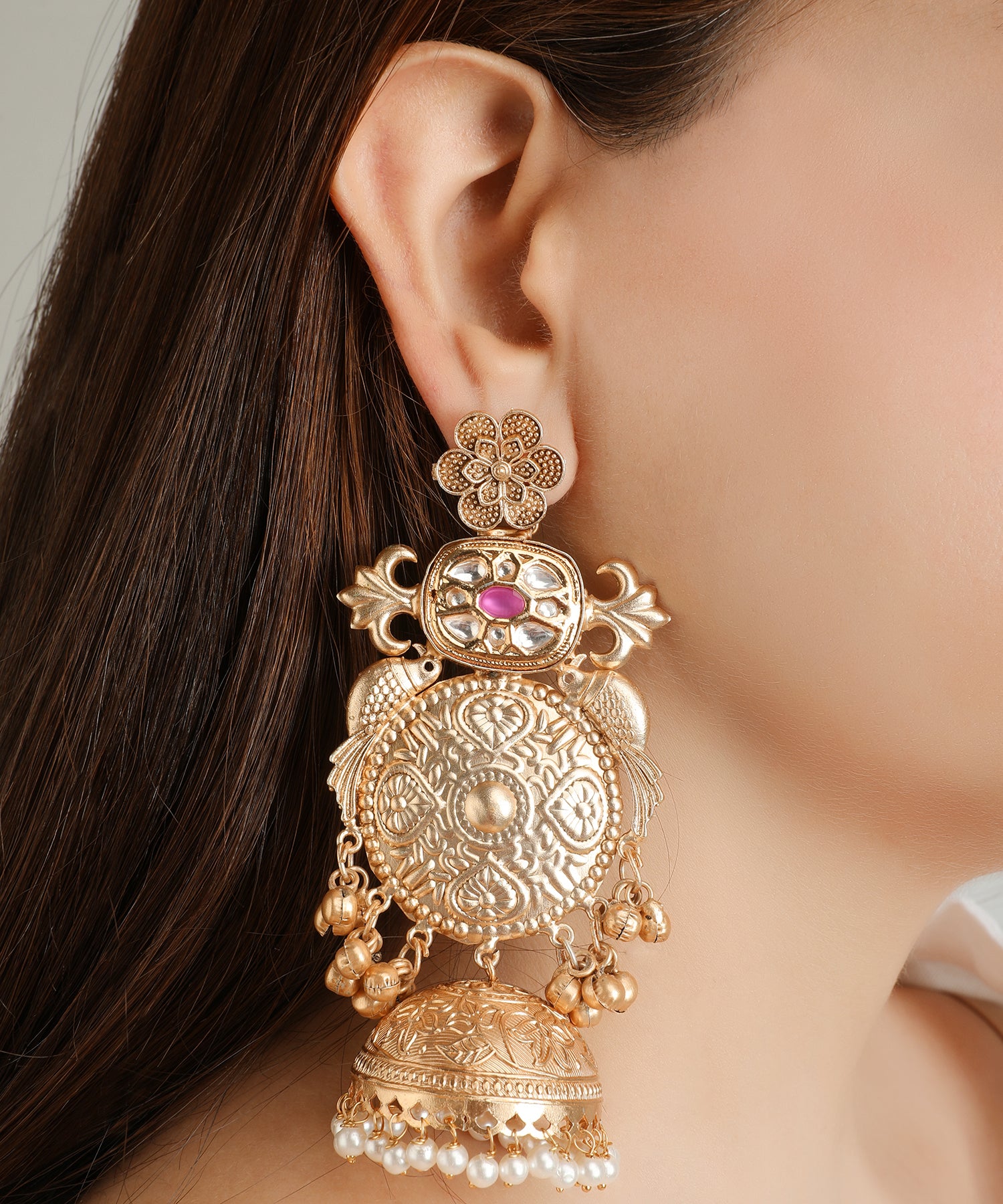 These exquisite floral round gold jhumka earrings are crafted with fine gold plating, adorned with lustrous pearls and a striking ruby centerpiece. The intricate circular design showcases traditional Indian craftsmanship, inspired by heritage artistry. Lightweight yet luxurious, these earrings are perfect for long festive occasions, weddings, and cultural celebrations. The delicate pearl drops add graceful movement, making them versatile to pair with sarees, lehengas, or even elegant fusion wear. Made with premium materials, these gold, pearl, and ruby earrings bring timeless beauty and enduring charm.