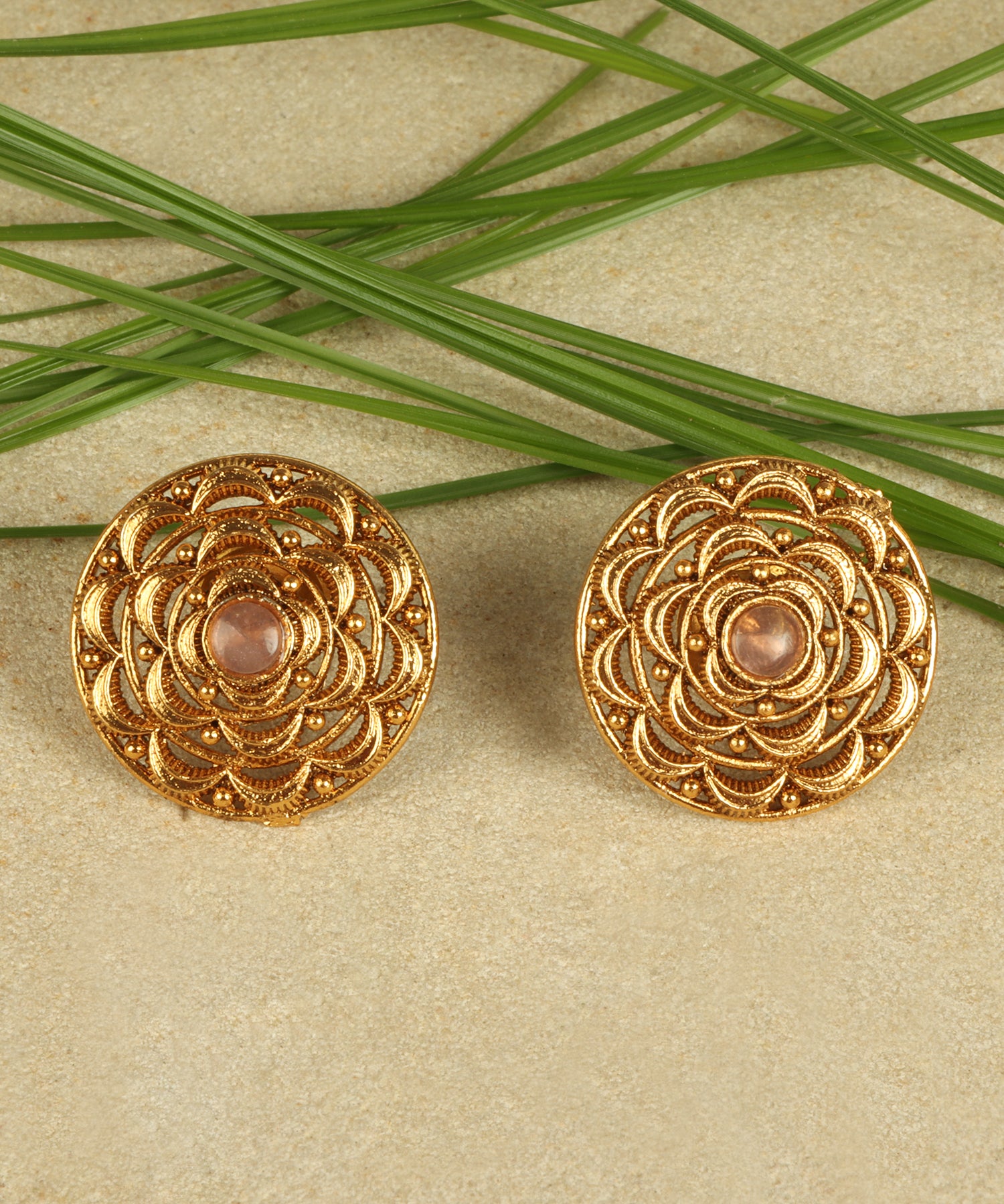 These Gold Round Floral Stud Earrings are crafted with intricate gold plating and adorned with a delicate pink stone at the center, creating a timeless floral motif. Designed in a classic round shape, these earrings draw inspiration from traditional Indian artistry while maintaining a contemporary charm. Lightweight and comfortable, they are perfect for daily wear or festive occasions. Pair them effortlessly with sarees, kurtis, or modern dresses. The rich gold plating and fine craftsmanship emphasize durability, elegance, and versatile styling.