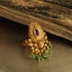 Handcrafted in a traditional design, this statement ring reflects the richness of Indian temple jewellery. | The centerpiece features a marquise ruby-toned stone, surrounded by intricate gold floral motifs for a regal look. | Green bead hangings add a vibrant touch, creating movement and festive charm. | Finished in antique gold plating, the ring exudes heritage elegance while being versatile for modern styling. | Adjustable band ensures a perfect fit, making it ideal for weddings, festivals, and celebratory occasions.