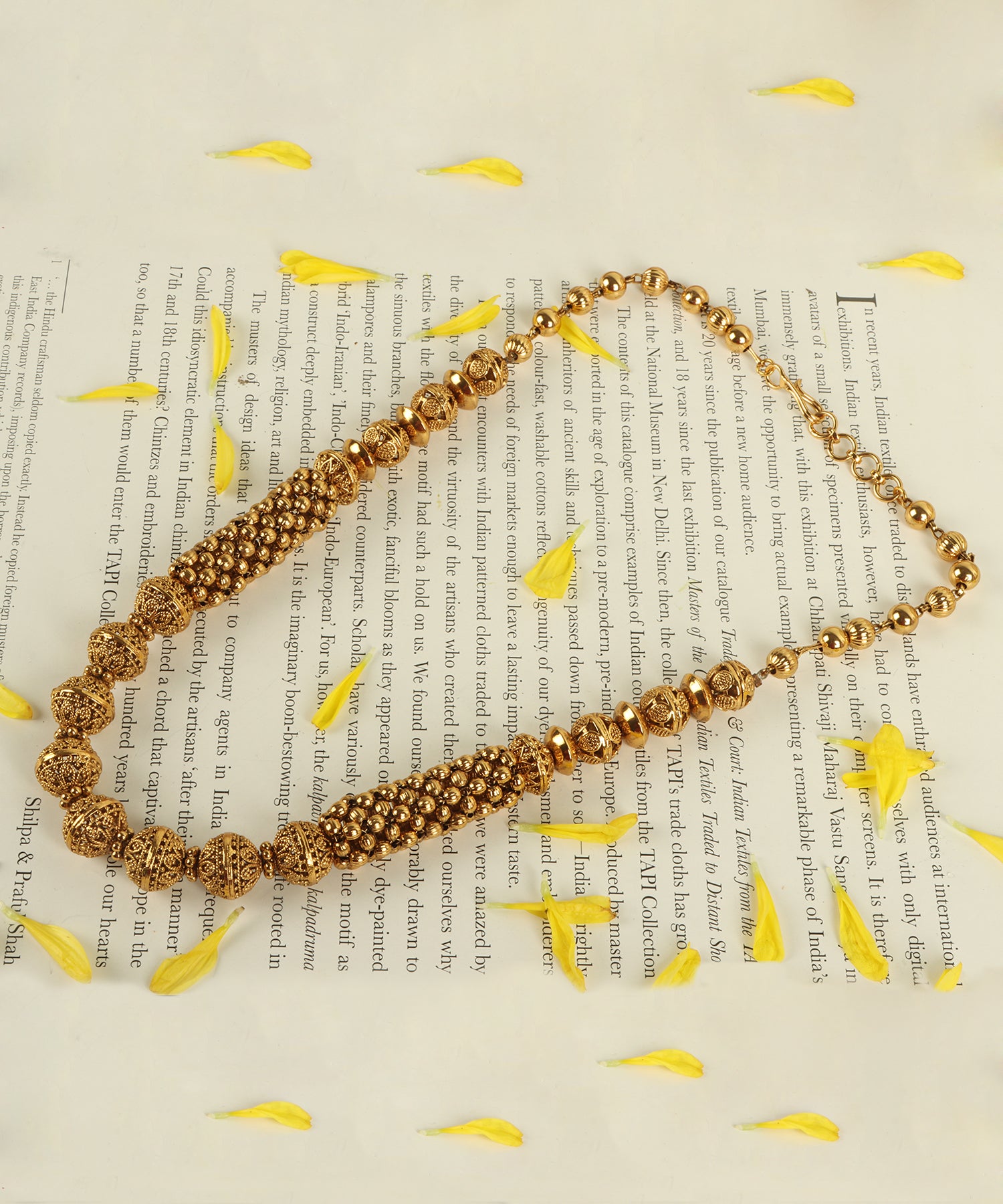 This elegant gold-plated string necklace showcases beautifully detailed spherical beads, crafted with precision to reflect traditional Indian artistry. The necklace is made from high-quality brass with a radiant gold plating that ensures both durability and shine. Lightweight and versatile, it pairs seamlessly with ethnic attire such as sarees and lehengas, as well as modern outfits for a chic contrast. A timeless piece, it embodies heritage craftsmanship while offering contemporary wearability, making it an ideal choice for festive, wedding, and special occasions.