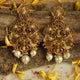 Traditional gold-plated temple earrings featuring goddess motifs and pearls, designed for weddings, festive celebrations, and cultural events. A perfect fusion of heritage artistry and contemporary elegance.