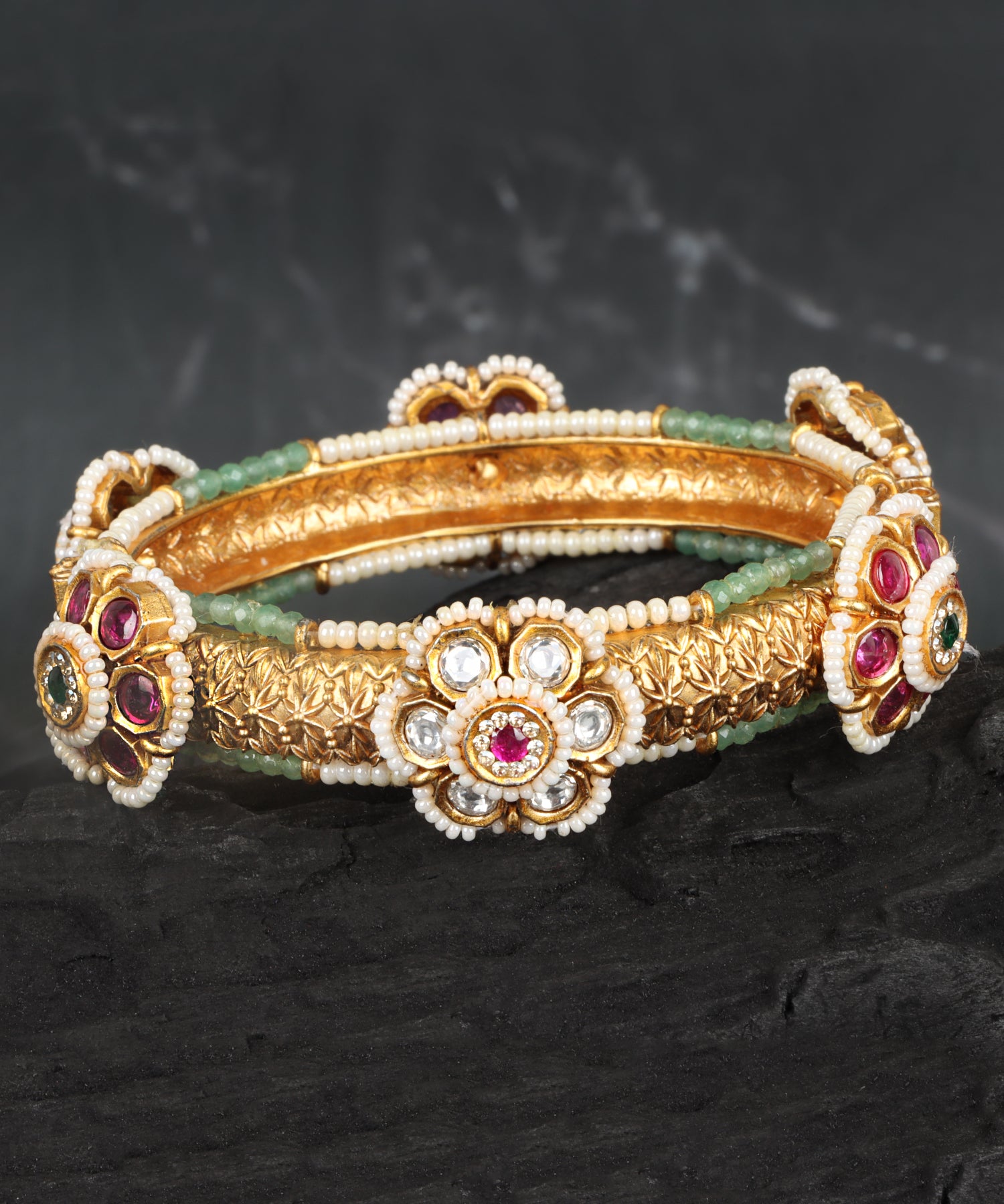 Heritage Pacheli Bangle with Polki Diamonds, Ruby, Emerald & Pearls