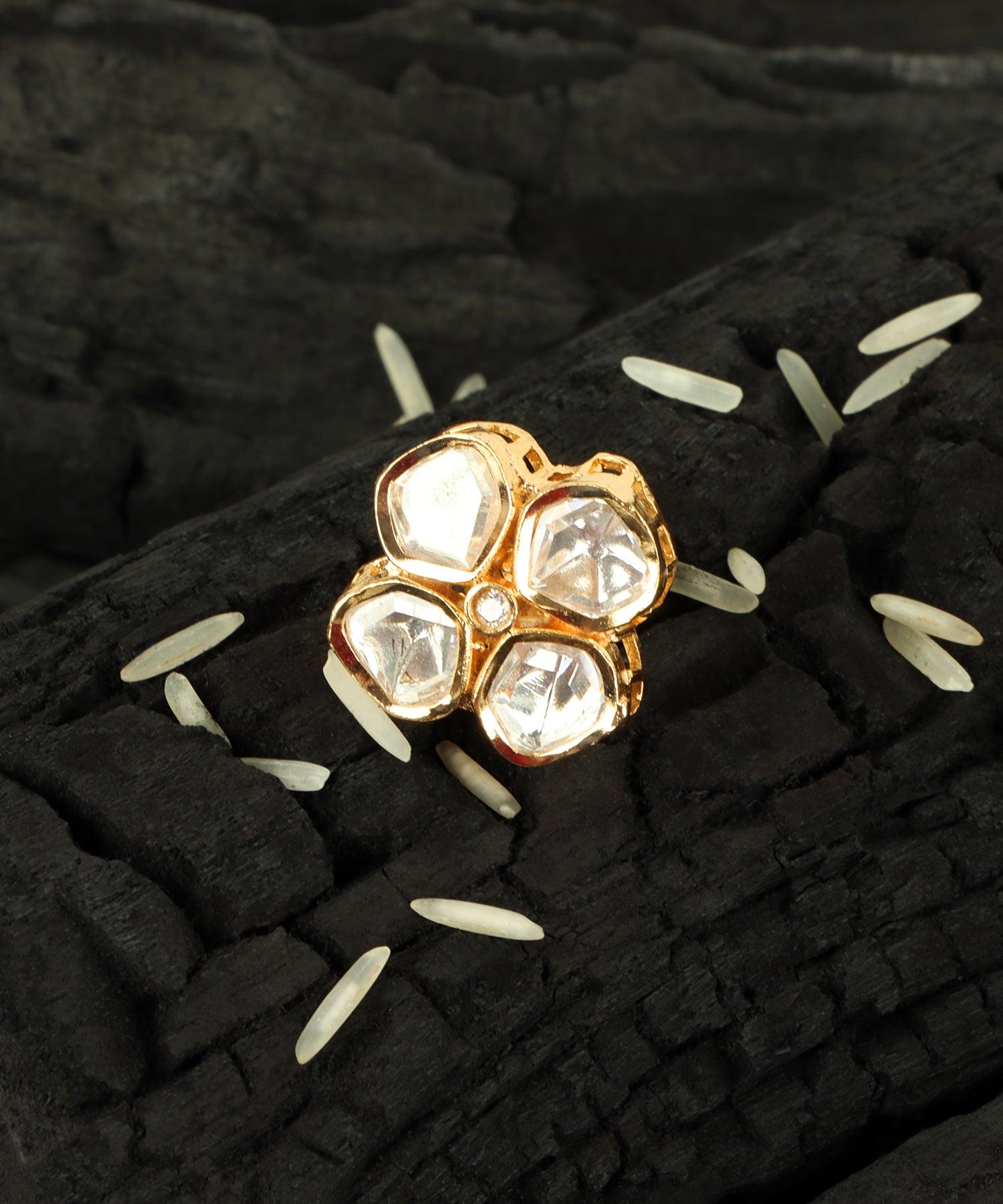Rooted in Rajasthan’s royal legacy, these handcrafted Polki stud earrings celebrate timeless artistry with uncut polki set in radiant gold plating. Inspired by Mughal traditions, the design features a graceful floral motif, where four Polki encircle a central stone, radiating understated elegance. Polki, the oldest form of jewelry, retains its natural brilliance, making each pair unique and heirloom-worthy. Perfect for weddings, festive occasions, and cultural gatherings, these studs also pair beautifully with fusion or contemporary outfits like silk blouses, dresses, or chic minimal wear, adding a touch of heritage luxury to modern style.