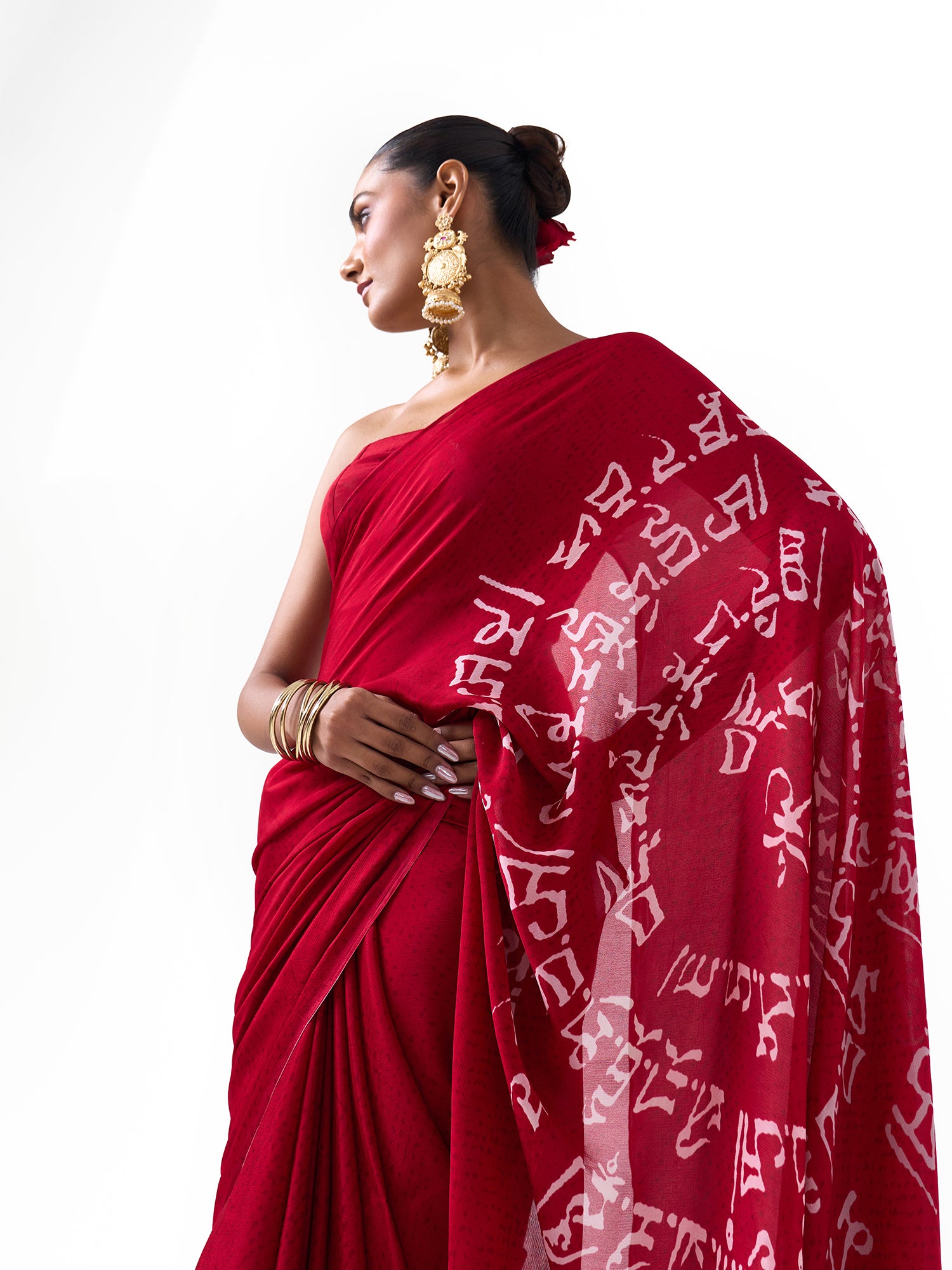 A striking sindoor-red saree featuring an artistic handwritten script pallu, blending poetry with bold modern minimalism. Graceful, fluid, and statement-making, it’s perfect for evenings, celebrations, and creative expression. A contemporary Indian drape that feels powerful, elegant, and beautifully unique