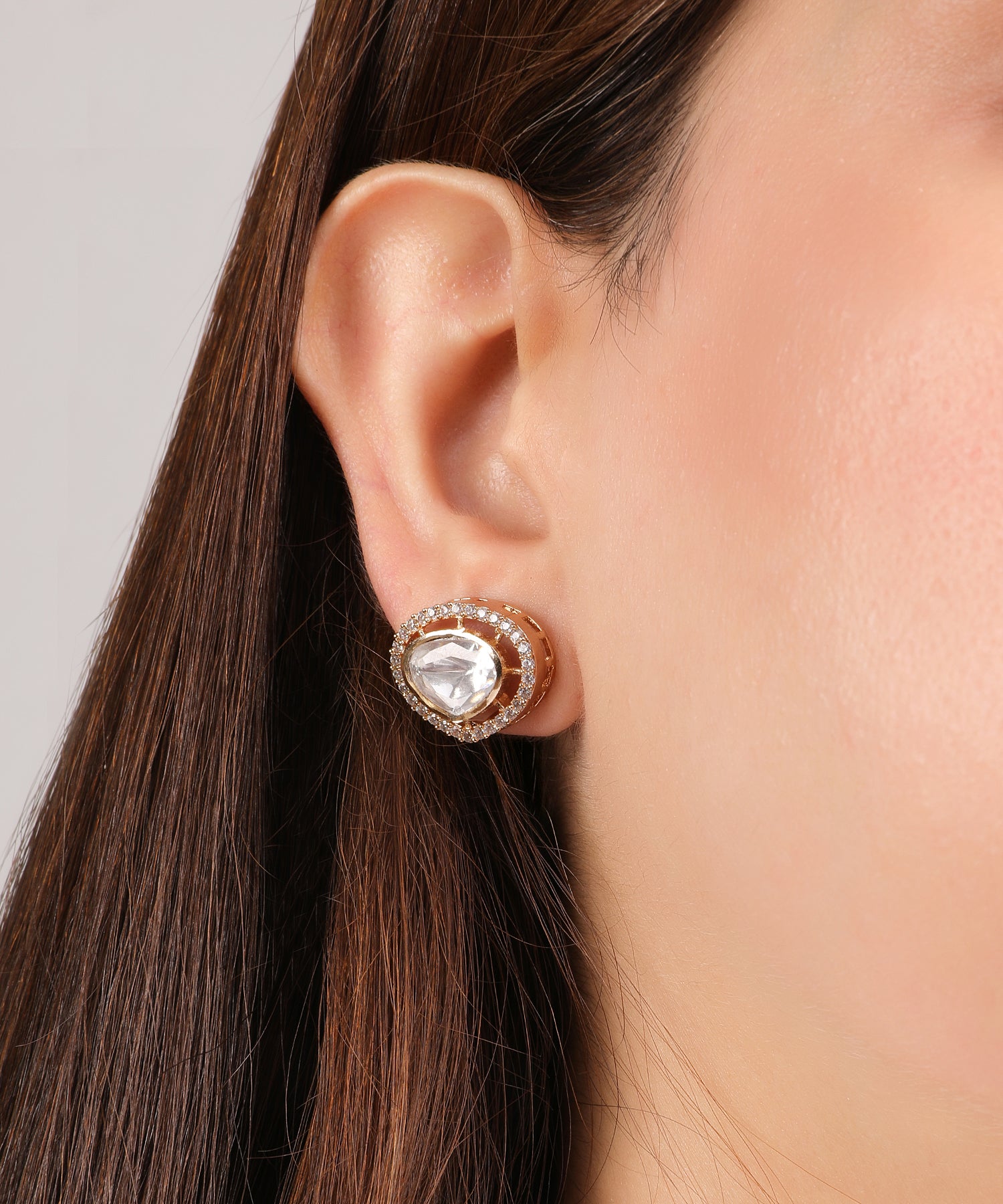 These exquisite gold stud earrings feature a timeless teardrop Polki stone at the center, encircled by delicate zircon accents. Inspired by Rajasthan’s rich jewelry heritage, Polki brings a royal, uncut brilliance that sets these studs apart. Lightweight and easy to wear, the elegant teardrop design adds sophistication to both ethnic and contemporary outfits. Perfect for weddings, festive occasions, or elevating everyday style, these Polki gold studs blend tradition and modern luxury into a versatile jewelry essential.
