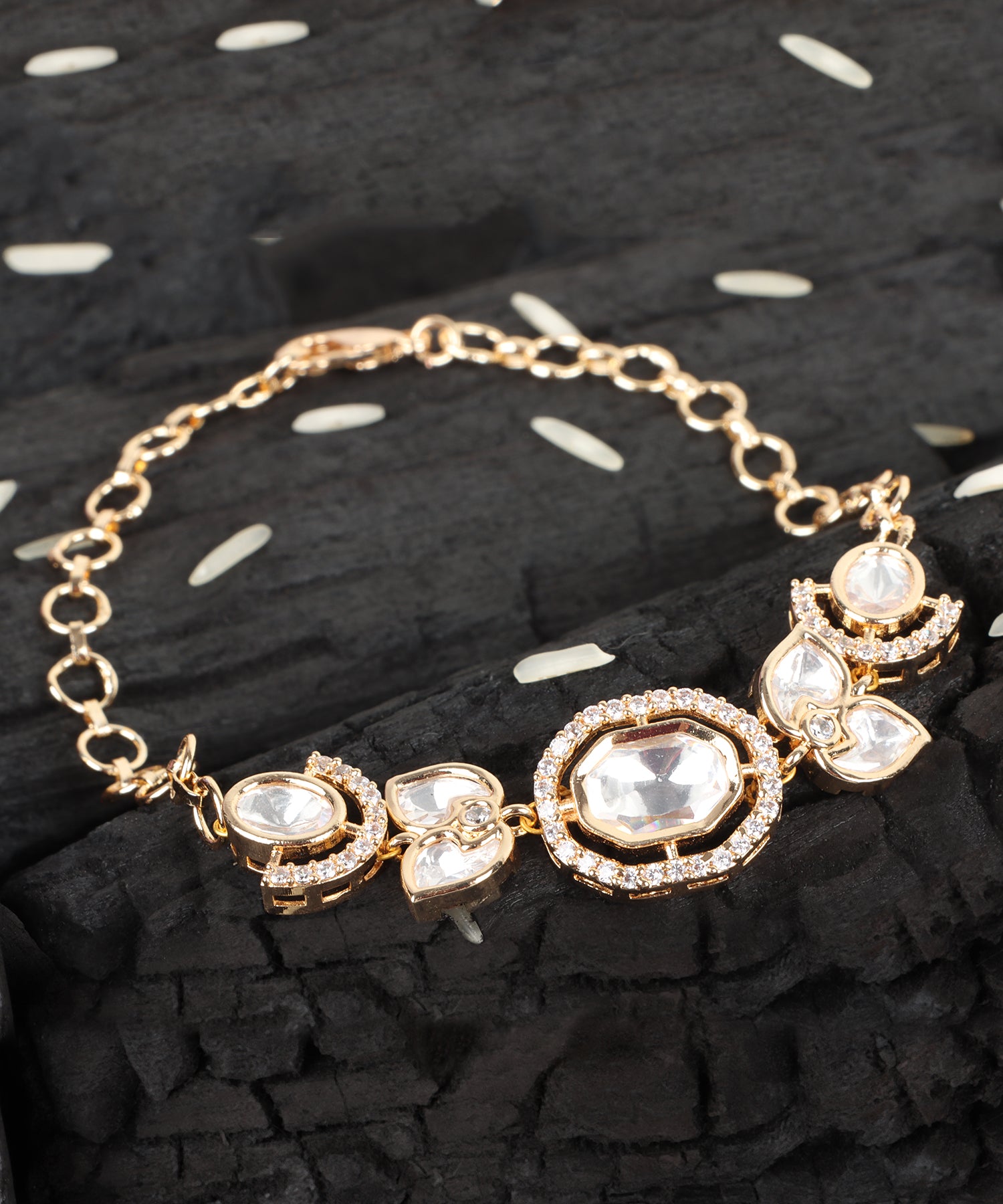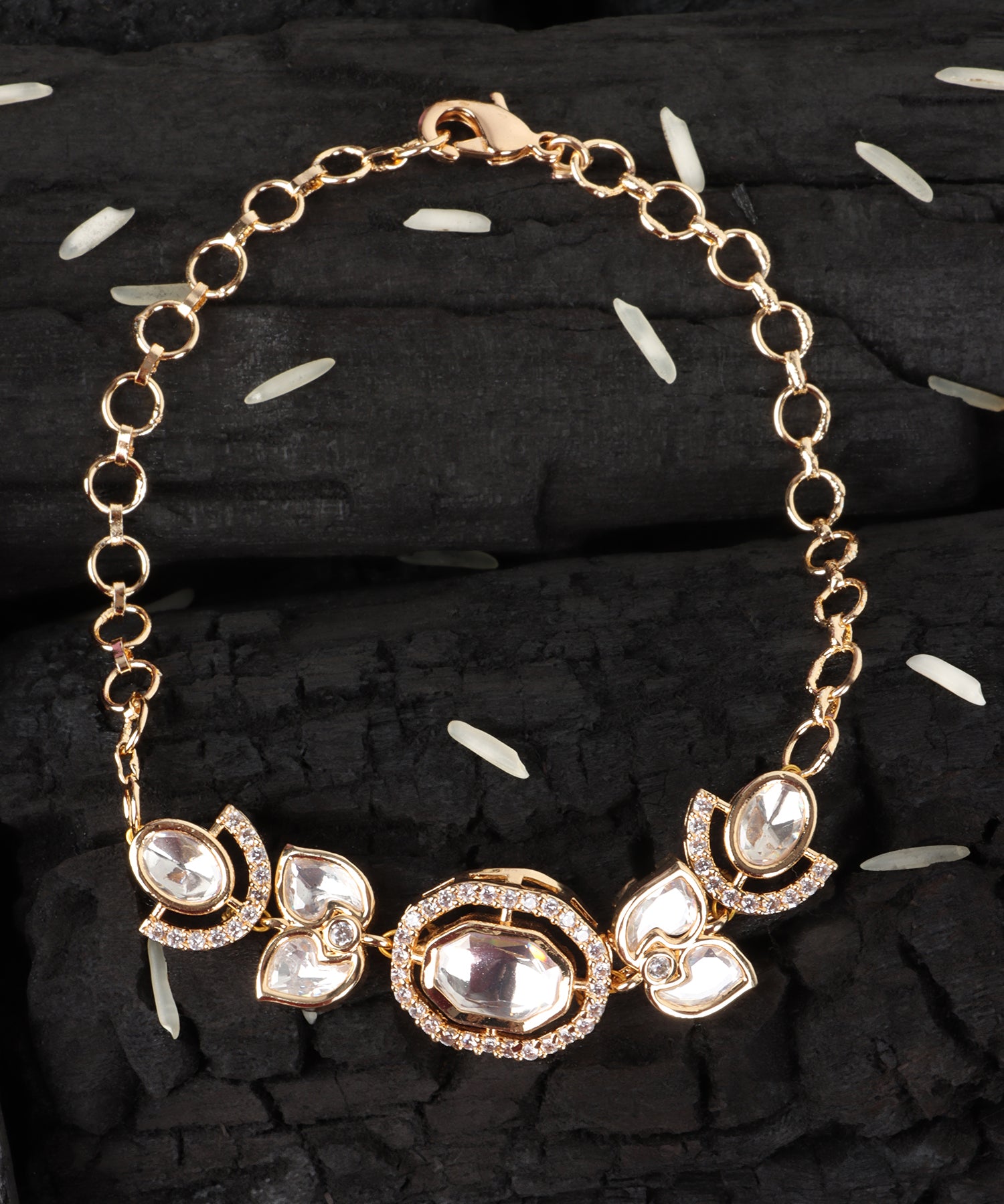 Handcrafted in glowing gold plating, this Polki bracelet brings together heritage and modern grace. The floral-shaped centerpiece is designed with oval and petal Polki motifs, symbolizing natural beauty and elegance. Inspired by the traditions of Rajasthan, the bracelet is remarkably lightweight and free size, making it easy to style and wear all day. Perfect for weddings, festive gatherings, or evening soirées, it complements both ethnic and modern outfits, ensuring you carry the charm of royal Polki jewelry effortlessly.