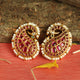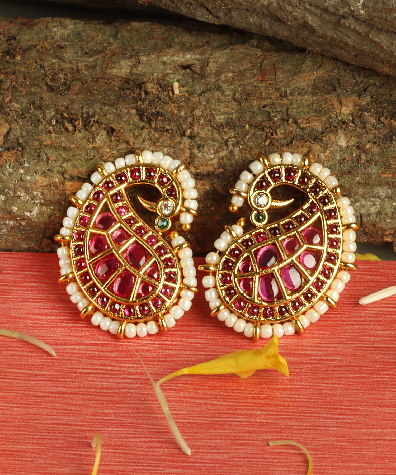 Traditional gold-plated earrings with ruby stones and pearl accents, crafted in a paisley design. A beautiful statement piece for weddings, festive celebrations, and classic ethnic ensembles.