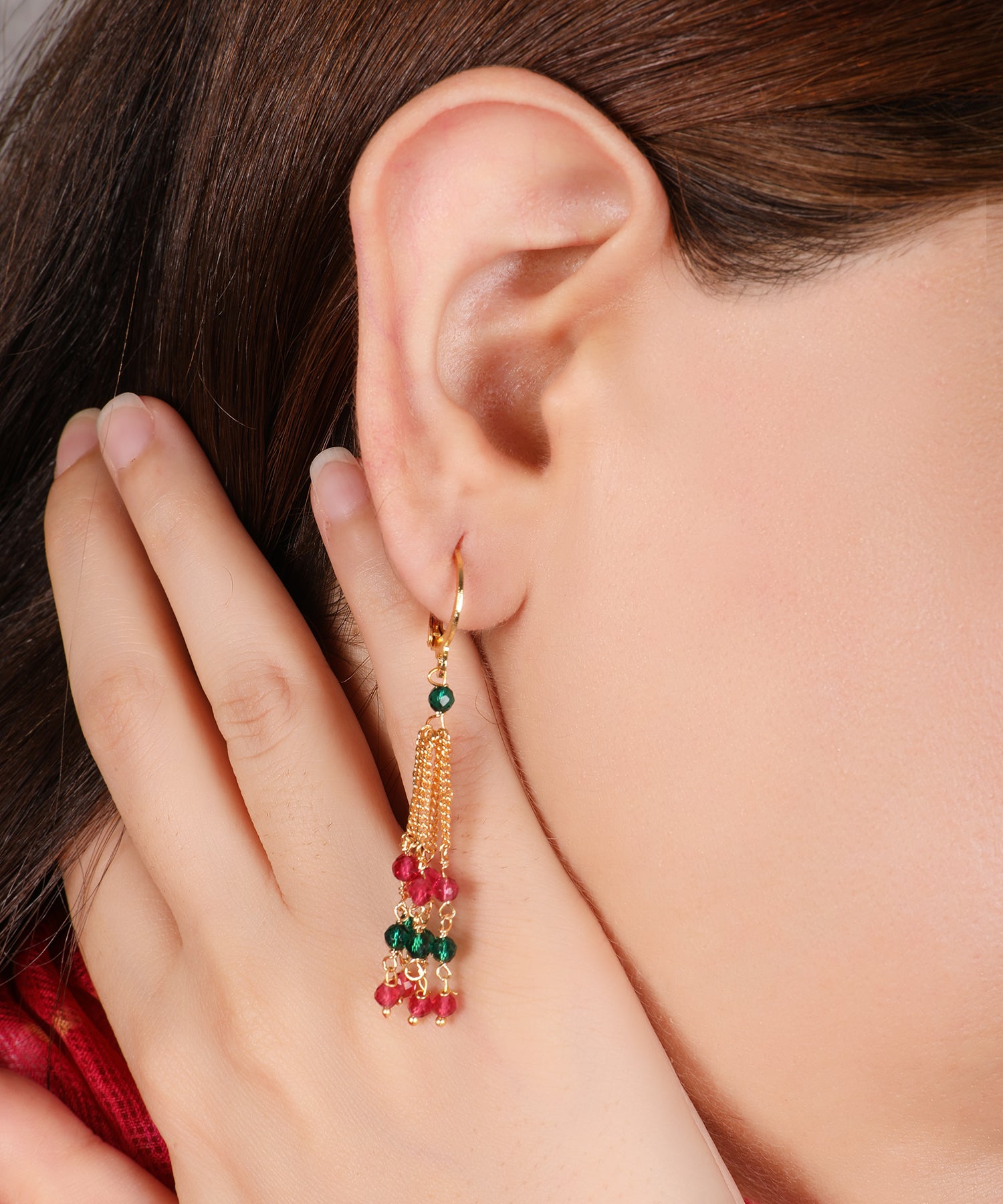 These lightweight gold-plated earrings feature cascading chains with ruby and emerald accents. Effortlessly stylish and comfortable, perfect for day-to-night wear and versatile styling.