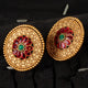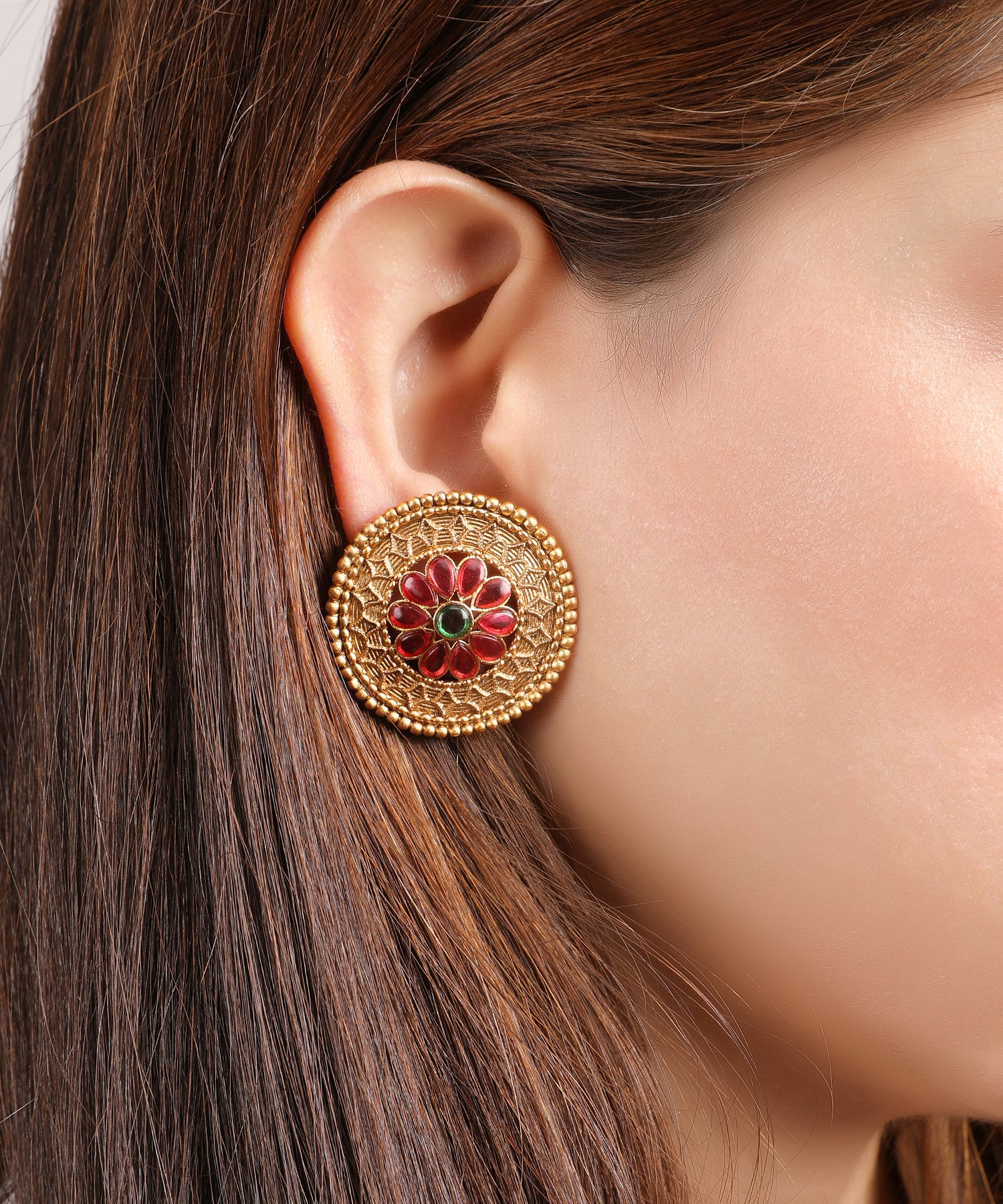 Crafted with fine gold plating, these elegant round earrings feature a striking floral design. At the center rests a vivid emerald stone, surrounded by rich ruby stones shaped like petals, symbolizing timeless heritage. Inspired by traditional Rajasthani craftsmanship, the circular shape adds regal charm while remaining lightweight and comfortable for long wear. Perfect to pair with ethnic sarees, lehengas, or even Indo-fusion outfits, these earrings blend luxury and tradition, making them a versatile addition to every jewelry collection.